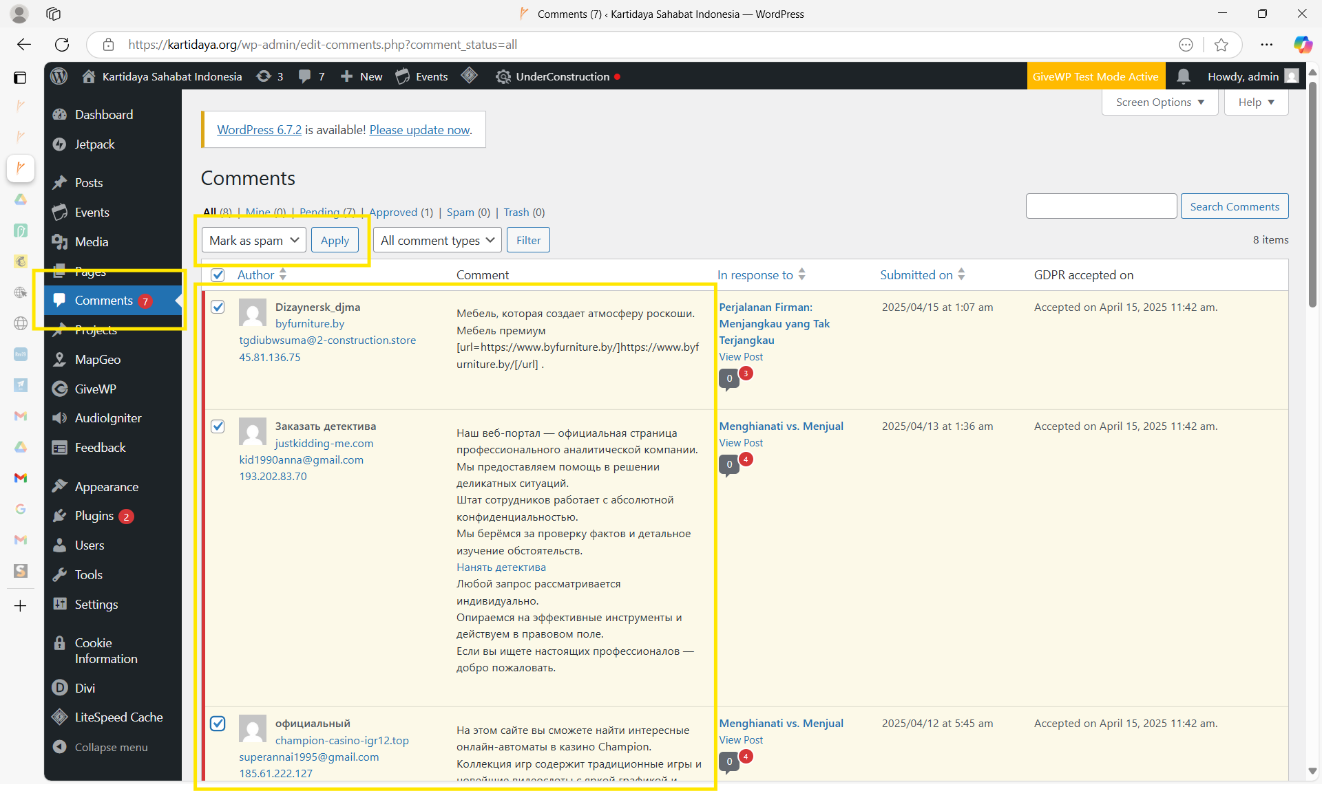 Berikut ini adalah langkah-langkah untuk menghapus pesan spam di situs web Kartidaya.org: